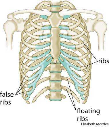 12对肋骨:分布在两侧,每一对肋骨在身体后侧通过两点附着在脊椎上,在前侧则附着在胸骨上。肋骨的前端由附着在胸骨上的软骨构成。第1-7肋分别附着在胸骨上,被称为真肋。第8-10肋通过共同的软骨附着在胸骨上,叫做假肋。第11-12肋不与胸骨相连,叫做浮肋。