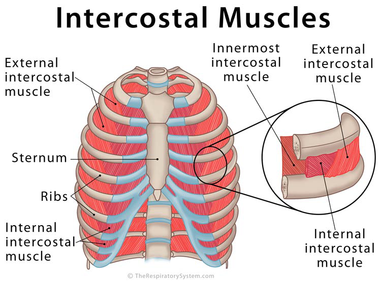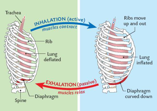 每次吸气时,肋腔通过吸气肌扩张。呼气时,肋腔呈现出弹性,回到原始形状。肋腔的运动会增加体积,在胸腔产生负压或者称吸气压力。