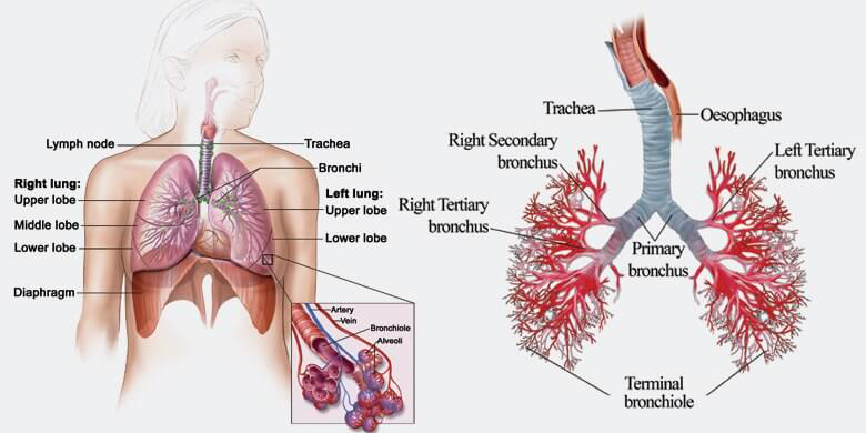 气管从声带(喉)下面开始,分为左右主支气管,分别进入两侧肺部。主支气管近一步分为更小的支气管(20-25个),终末细支气管最终成为葡萄状肉质结构,称为肺泡,换气在肺泡中发生。每一个肺泡直径大约在0.2毫米,两肺的肺泡总数大约在3亿左右。若将肺泡的表面积全部打开,将会达到70平方米,相当于一个网球场的面积!!是不是很神奇??!!
