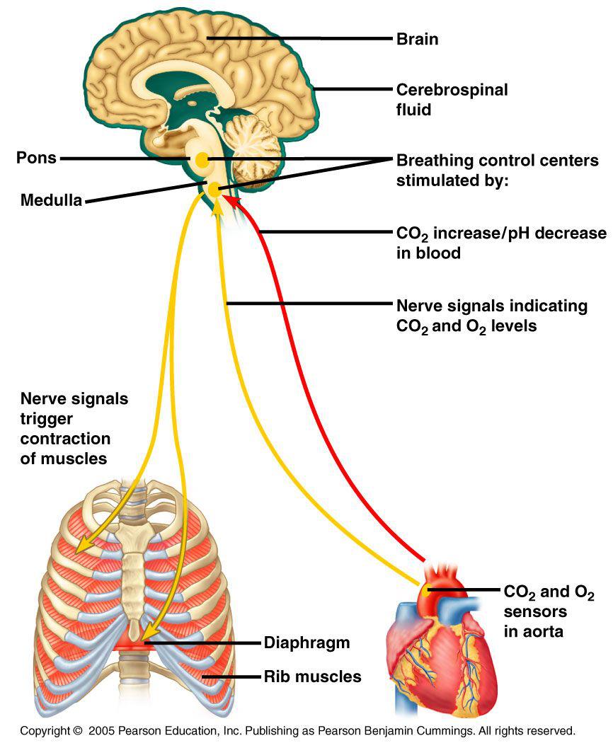 由于这一关键呼吸中枢的存在,无论是做各种各样的活动,还是在进行锻炼(甚至是剧烈的锻炼),抑或处于睡眠状态,呼吸始终是一项正常且非自主的行动。如果这一中枢因为事故或中风而受损,患者在没有人工换气的情况下可能会丧失生命。