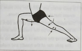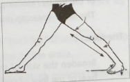 分开双脚,右腿向外转,左腿向内转。躯干转向正右方。保持双膝伸直。