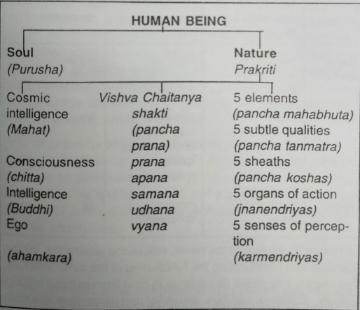 人体由土水火风空五大元素构成,分别对应着头脑、智性、自我、意识和灵魂。这五大元素被称为身体的五个壳层,即肉体层、生理层、心理层、智性层和灵性层。五大元素能够控制五个行动器官——手臂、腿、口、生殖器官和排泄器官。同样,五大元素还具有精微属性,即声、触、色、味、香,这些精微属性由五个感知器官所感知,即耳朵、皮肤、眼睛、舌头、鼻子。根据《歌者奥义书》(Chandogya Upanishad),眼睛属于生命气(pranavayua),耳朵属于遍行气(vyana vayu),舌头属于下行气(apana vayu), 鼻子属于平行气(samana vayu),皮肤属于上行气(udhana vayu)。