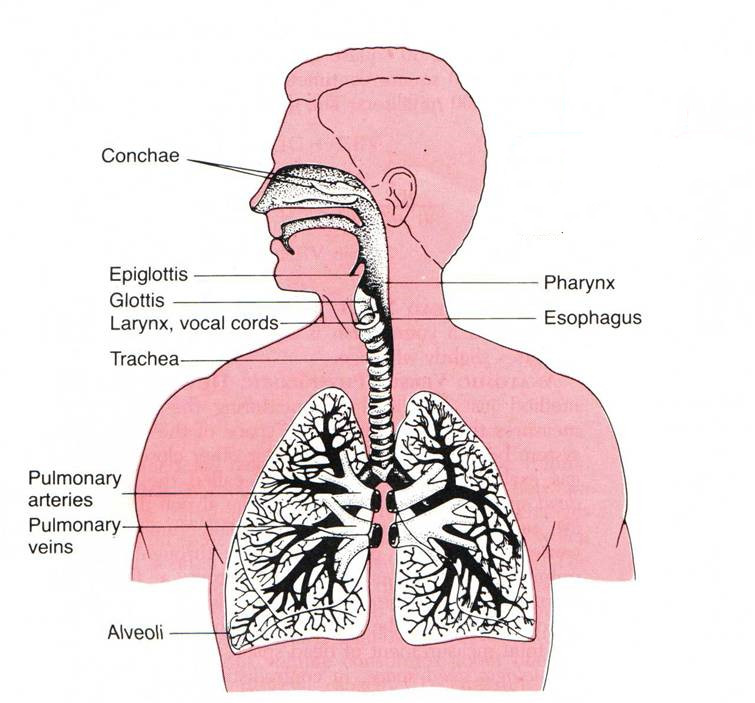 人的两肺存在于胸腔,受到肋腔的保护。右肺比左肺稍大,由三片肺叶构成,左肺仅有两片肺叶。除了两肺,呼吸系统还包括鼻孔、咽喉、气管、支气管、细支气管、肺泡。吸气时,空气从鼻孔经过咽喉,然后通过10厘米长的气管。气管分为两个支气管,分别进入两肺。每一个支气管又分为若干个分支和次级分支,叫做细支气管,细支气管进入若干个微小的肺泡。肺泡常常被比做一串葡萄。每一个肺泡都由微小的血管或毛细血管覆盖。肺通过肺泡表面的毛细血管发挥功能,即清除体内浊气,代之以洁净的新鲜空气。